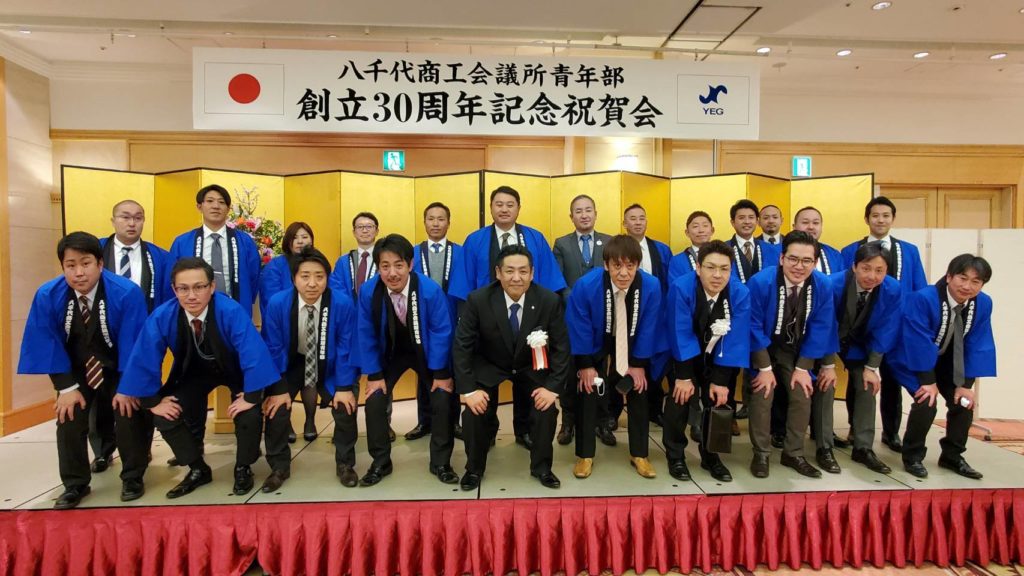 令和5年1月19日、八千代商工会議所青年部の「30周年記念式典・祝賀会」が、「ウィシュトンホテル・ユーカリ」にて、万全の感染症対策の下、盛大に開催されました。 式典では、八千代商工会議所会頭・周郷寿雄様はじめ、各来賓の皆